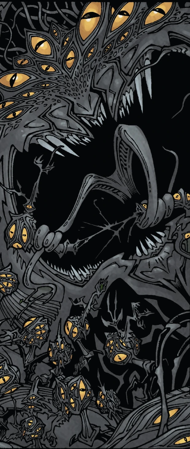 Curiously, the demons are never once identified as the Children of Leng, leaving their proper name permanently unspoken. Furthermore, the realm the demons reside in appears to be a galaxy-like dimension full of blue light and black smoke, while the demons manifest as bullet-like wisps when they enter the material world by the Omega Key.[12][13]