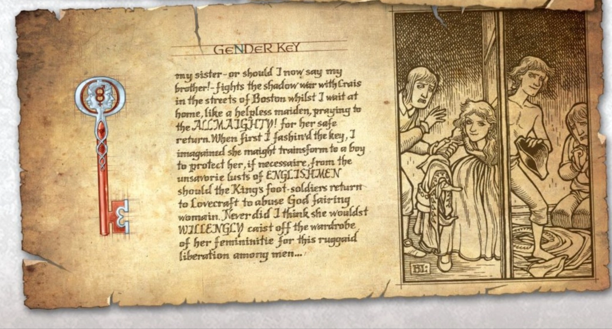 The Gender Key was created by Benjamin in order to aid his sister, Miranda Locke, become a man, presumably to enlist in the American Revolution.[1]